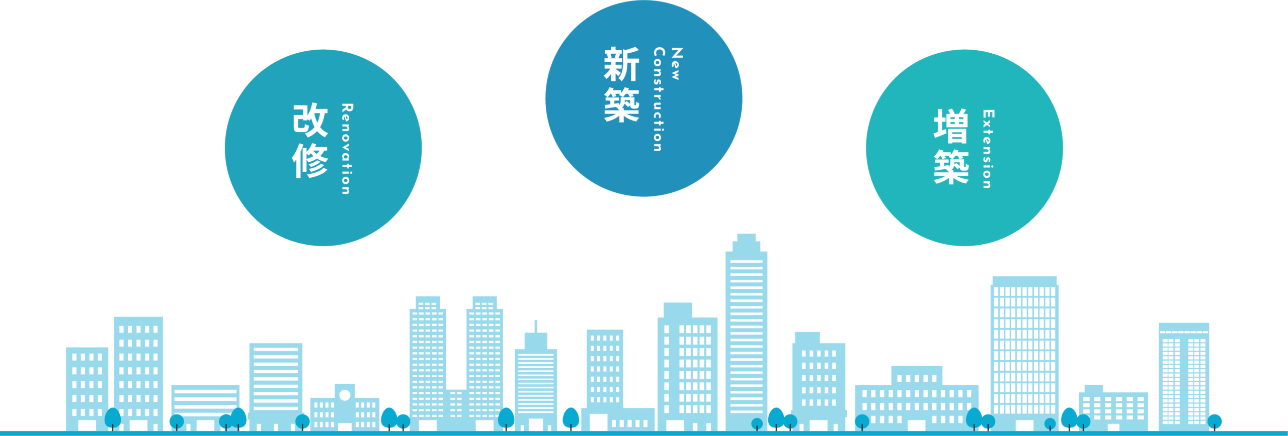 | 04 | 施工(新築・改修・増築) | 熟練の職人が、図面に基づき安全第一で施工を行います。建設現場の工程に合わせ、納期を遵守した確実な工事を進めます。 |